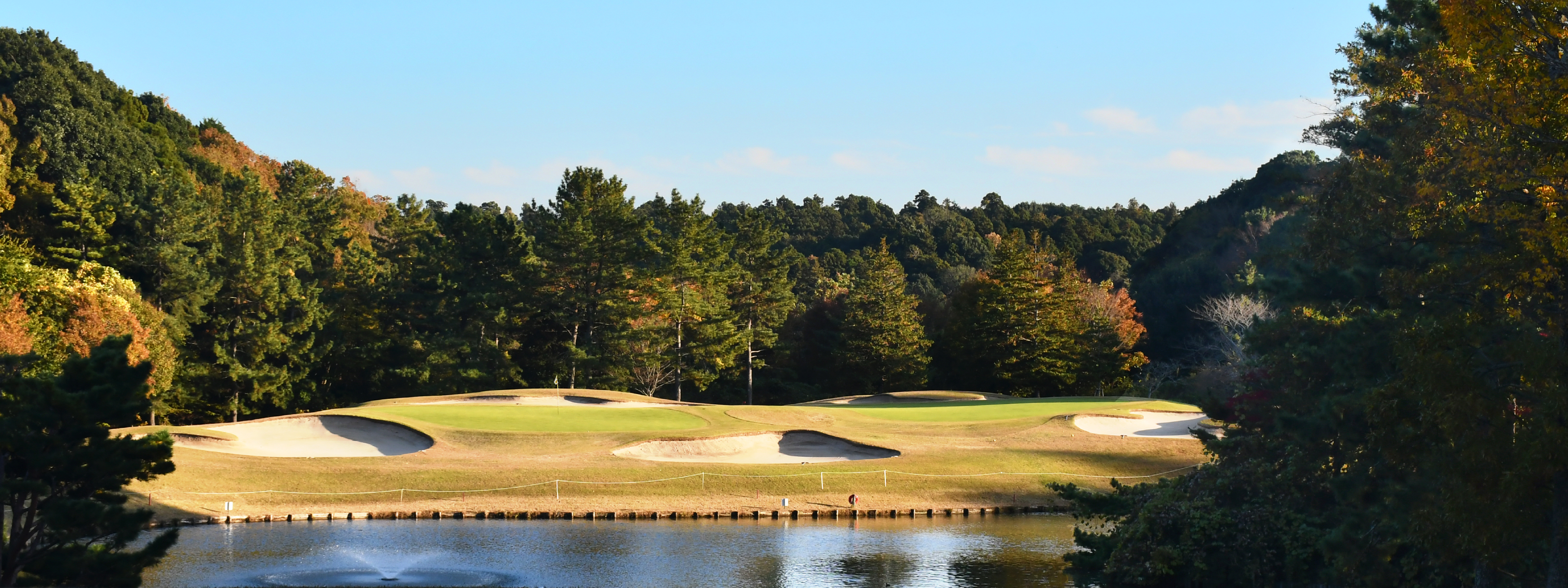 池越えのショートホール。距離表示を確認し、風の読みも慎重に。