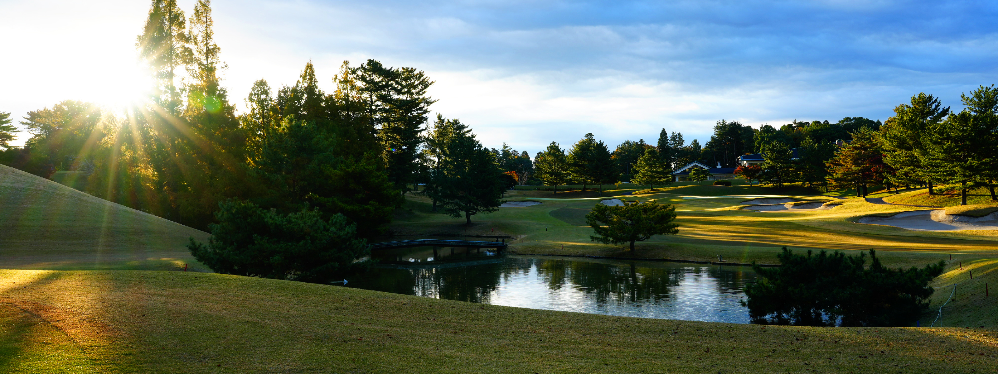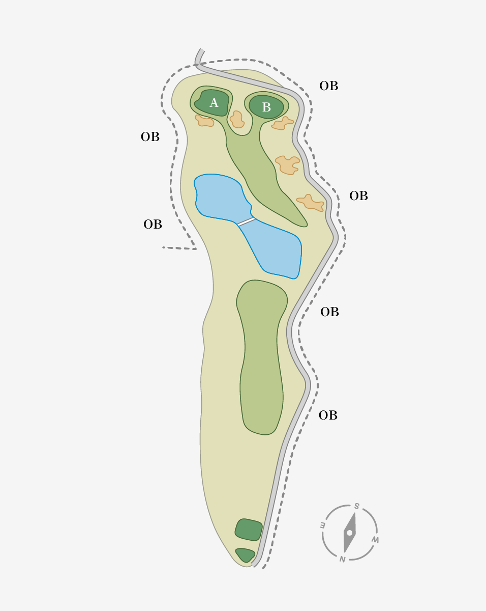 中央にひょうたん池の待ち受けるロングホール。ティーショットの出来次第ではセカンドで無理をせず、池手前に刻む選択も。2オン狙いなら左サイドをキープ。