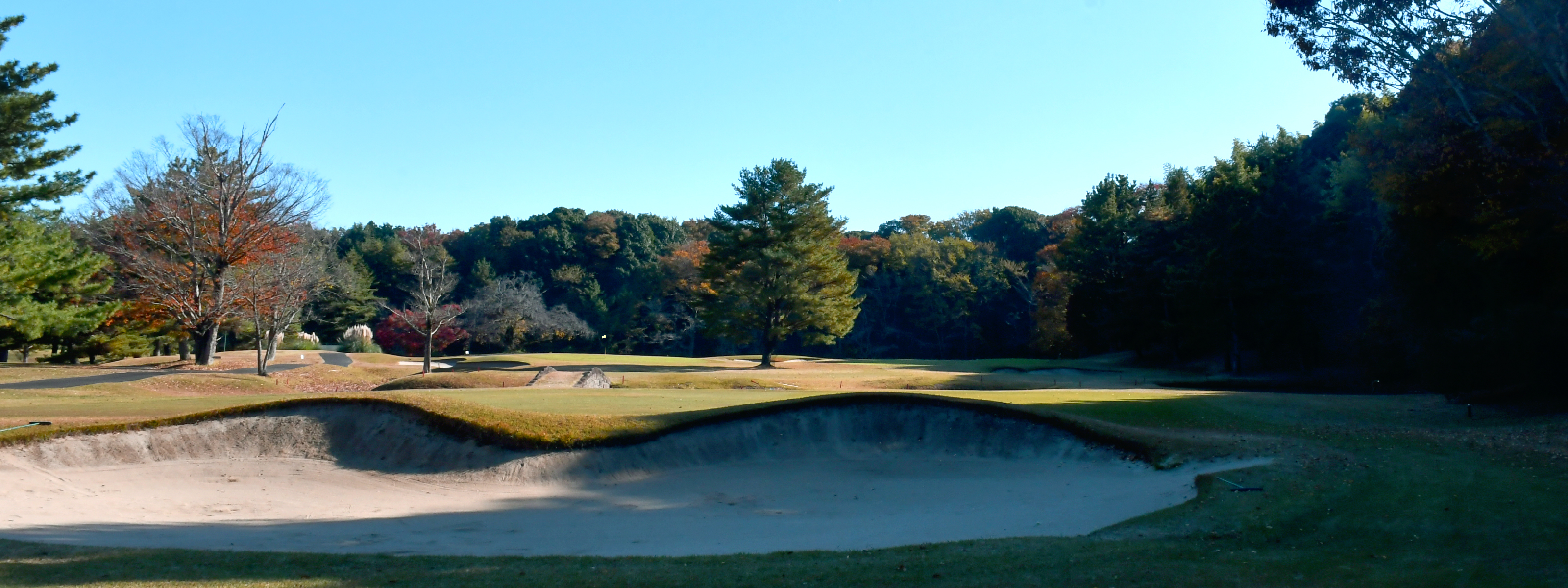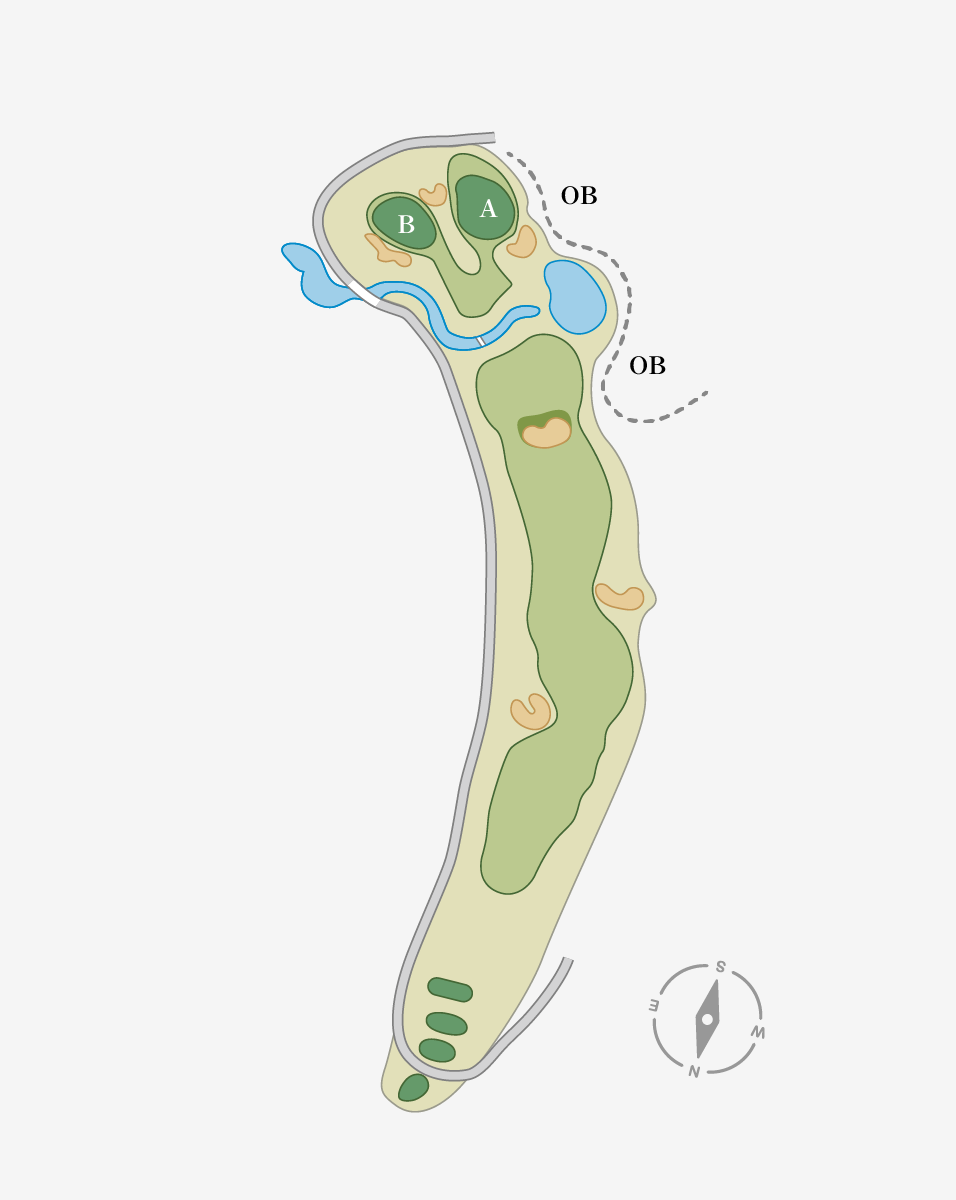左ドッグレッグのロングホール。ロングヒッターは左のクロスバンカー越えで最短距離を。グリーン前にクリーク、その手前に深いフェアウェイバンカーあり。狙うか刻むか迷いは禁物。
