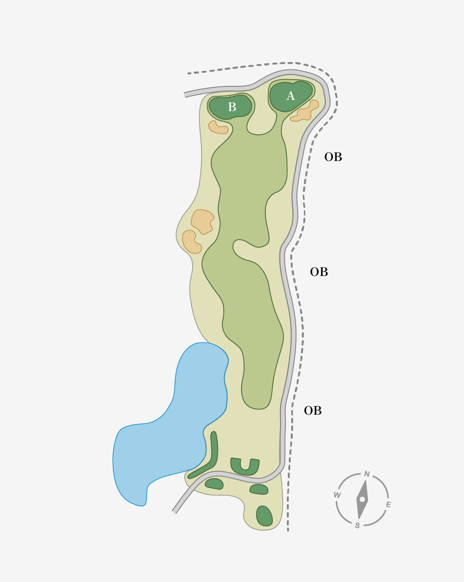 ティーショットはマウンドを避け、左クロスバンカー狙い。ロングヒッターならマウンド越えを狙いたい。