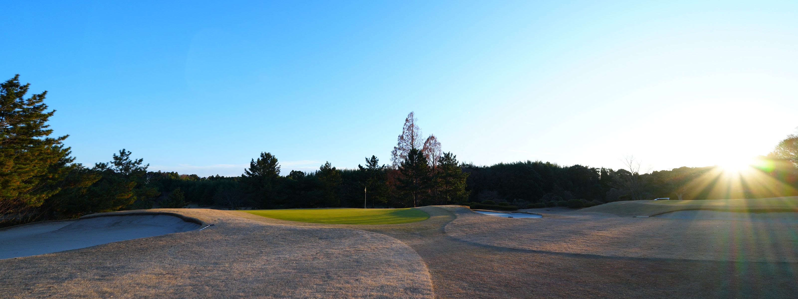 距離のあるミドルホール。ティーショットは左右のOBと池を意識せずに右クロスバンカーの左狙い。