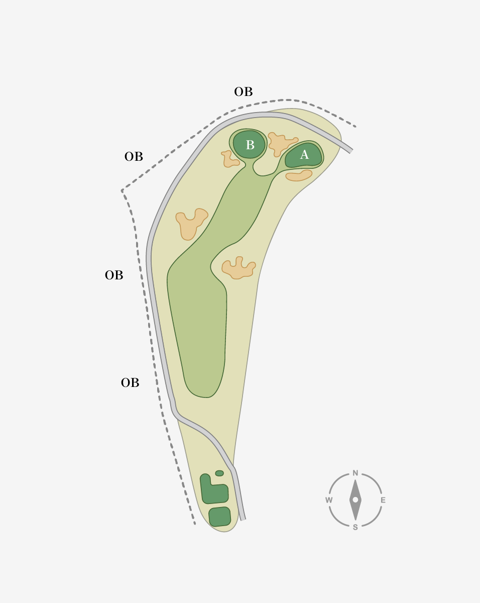 ティーショットは左クロスバンカー狙い。Aグリーンはやや砲台となっているため、セカンドの距離感に注意。