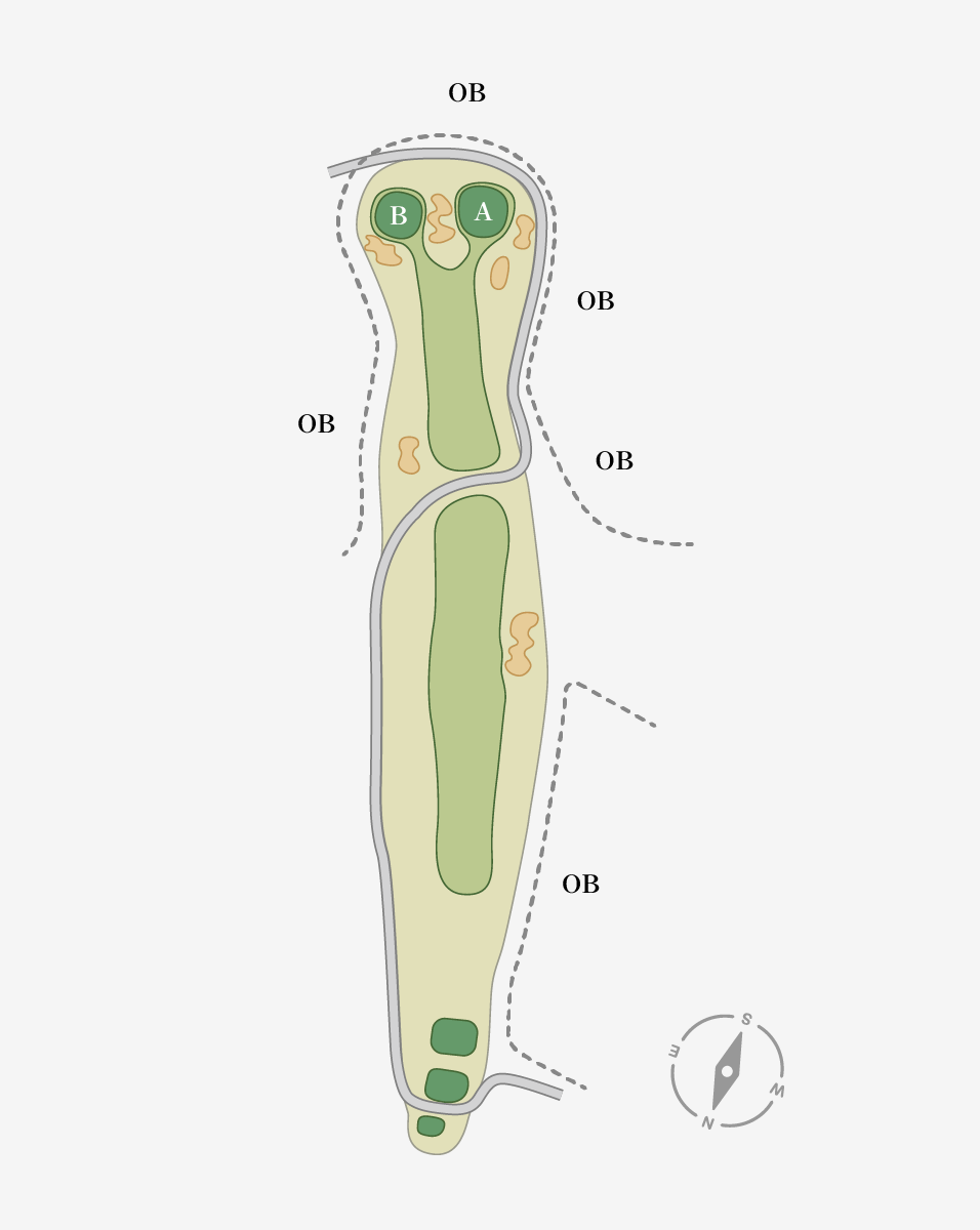 打ち下ろしのロングホール。ティーショットはフェアウェイのセンター狙い。飛距離に自信がある方は2オン狙いを。ドラコン推奨ホール